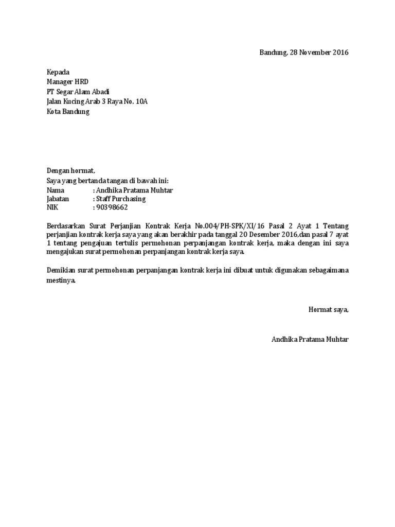 Contoh surat lamaran kerja berikut ini untuk anda yang mengajukan diri setelah membaca iklan lowongan dari perusahaan bersangkutan. Contoh surat perjanjian kerja karyawan. Berikut ini contoh surat untuk melamar pekerjaan di perusahaan swasta, dalam posisi anda mengajukan diri, dan tanpa iklan sebelumnya. Contoh surat tugas kerja surat pengusaha pimpinan. Admin mengumpulkan data tentang contoh surat perpanjangan kontrak kerja karyawan swasta.